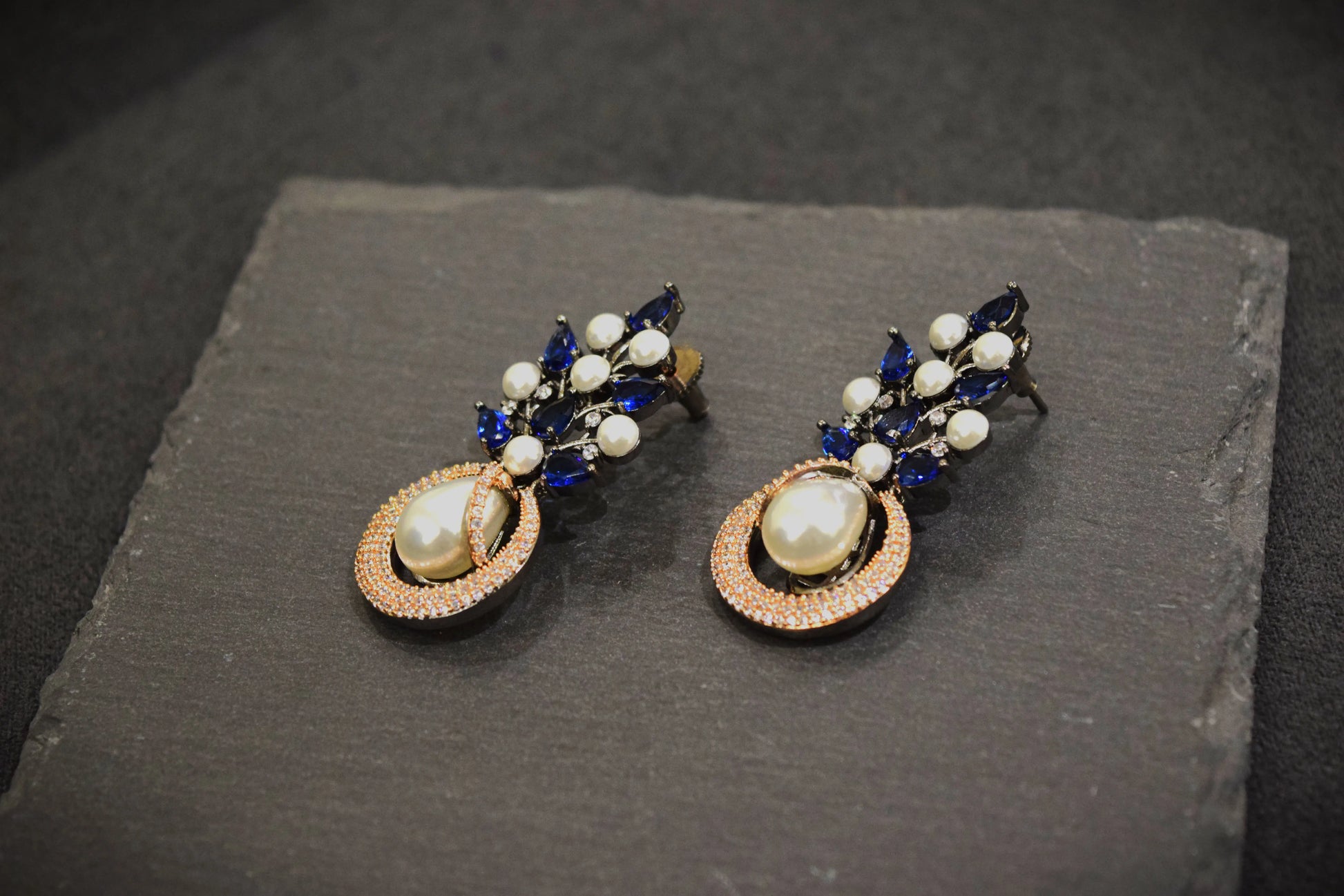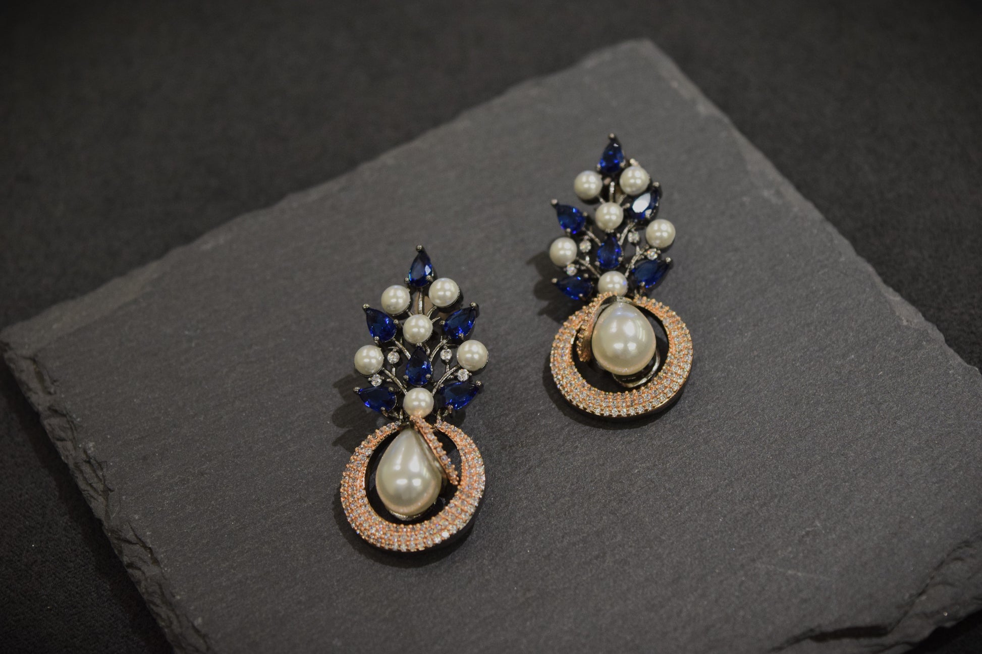 AMERICAN DIAMOND EARRINGS WITH BLUE STONE AND PEARL DROP